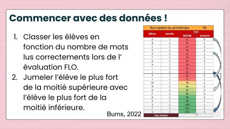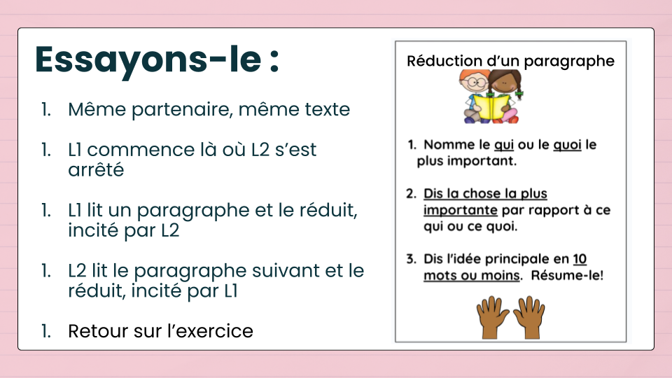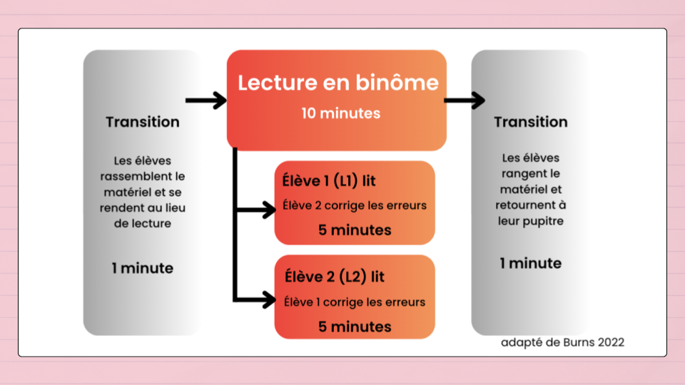 La lecture en binôme est un programme pédagogique fondé sur des données, à fort impact et facile à mettre en œuvre. Grâce à cette routine quotidienne de dix minutes, les élèves améliorent leur fluidité et, par la suite, leur compréhension des textes. La réduction des paragraphes est une stratégie supplémentaire qui s’accompagne d’une routine quotidienne de dix minutes pour aider à améliorer la compréhension. Utilisez ces diapositives pour comprendre le pourquoi et le comment de ces interventions importantes.