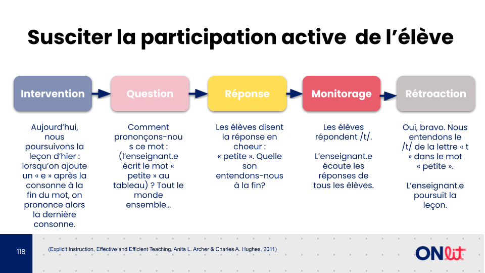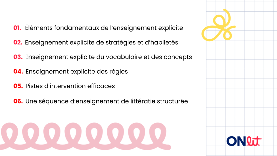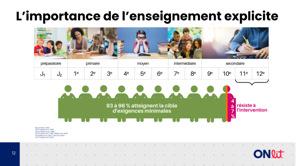 L’enseignement explicite est un enseignement clair, direct et ciblé de connaissances, d’habiletés et de stratégies précises. Cette présentation propose une compréhension commune de l’enseignement explicite et ses éléments fondamentaux, l’enseignement des stratégies et habiletés, l’utilisation de la rétroaction et des pistes d’intervention l’enseignement explicite du vocabulaire et présente une démarche d’enseignement.