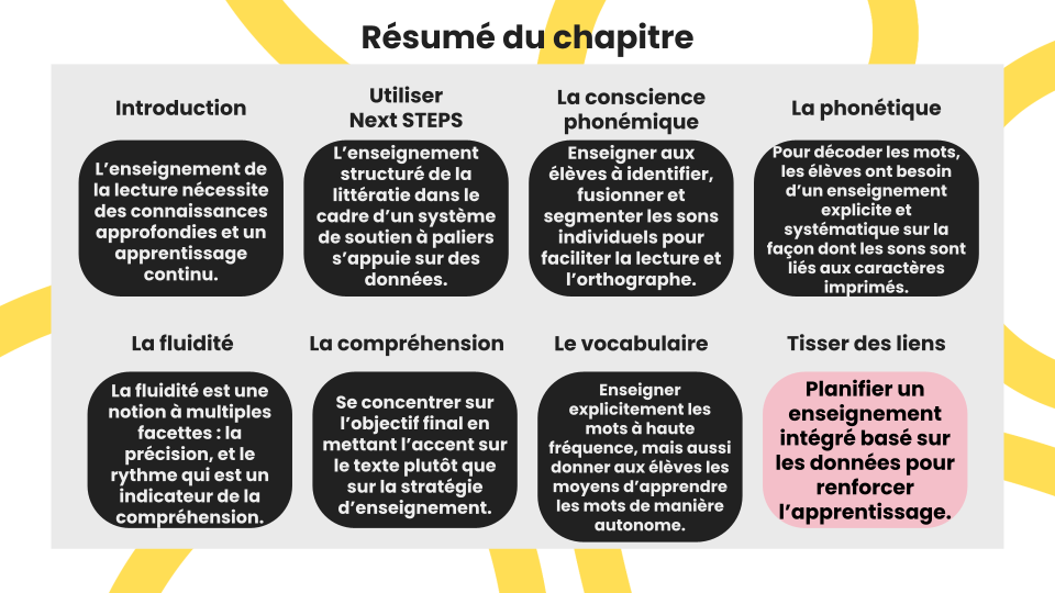 Le livre met en lumière les fondements de l’enseignement explicite et de l’évaluation fondée sur des données probantes, puis passe en revue les « Big Five » de l’enseignement de la lecture : il explique ce qu’est chaque élément, pourquoi il est important, et inclut un menu d’activités pédagogiques que les éducateurs peuvent mettre en pratique. Développées par Jordan Sloan, les diapositives contiennent des éléments clés et des questions de discussion pour chaque mouvement, encourageant ainsi une discussion perspicace et la collaboration entre vos collègues.