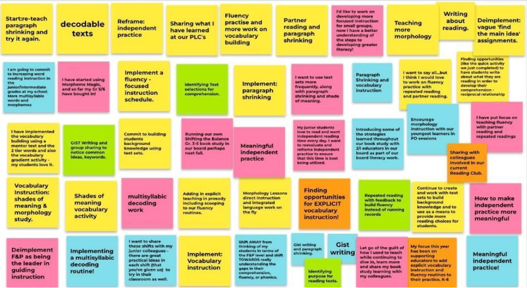 Leigh is also an active member of ONlit, answering educator questions with the Curriculum Assistance Team and developing content and professional learning events. In addition to answering inquiries through the online form regarding structured literacy and screening in French Immersion classroom, led the Shifting the Balance Junior/Intermediate Series book study last year. Reflecting on her experience leading the book study, Leigh shares, “It was an absolute treat to work through this book with Junior and Intermediate educators from around the province. A key takeaway was that educators of our older elementary students are hungry for learning around effective instruction and improving literacy.” The book study explored essential aspects of literacy, such as background knowledge, vocabulary, and decoding multisyllabic words. Leigh highlights the importance of comprehension strategies, noting, “The chapter on comprehension strategies was so powerful. It highlighted the importance of having texts at the centre of our strategy instruction.” During the last session, the group was asked to share their own ‘next steps’. Check out their amazing ideas:
